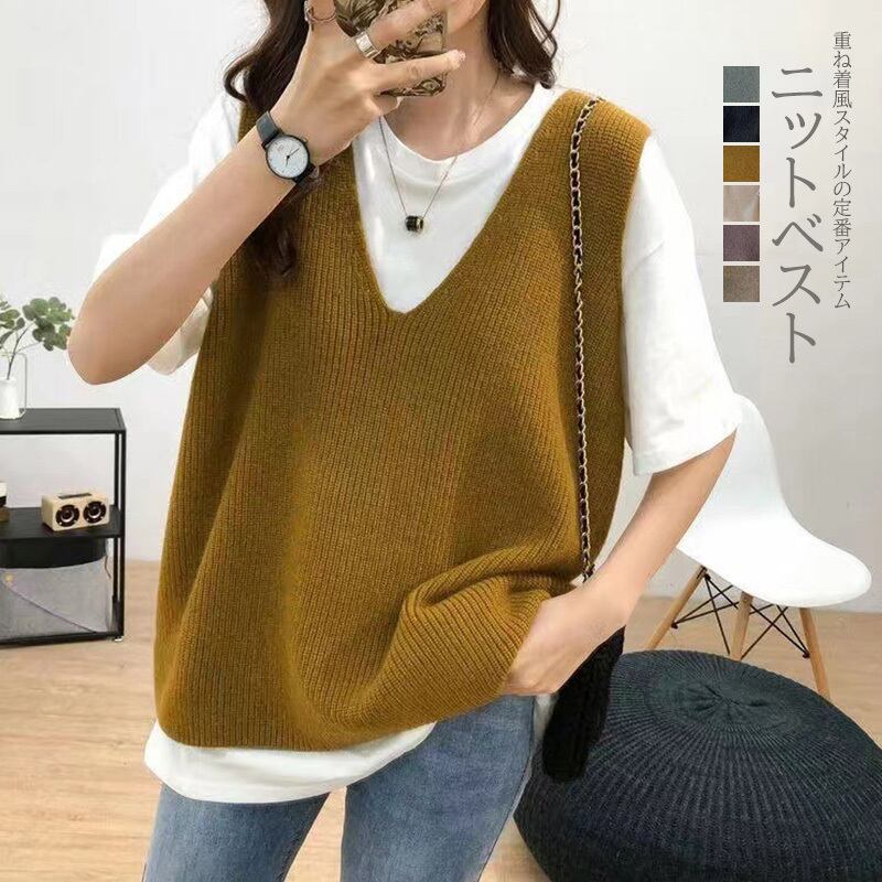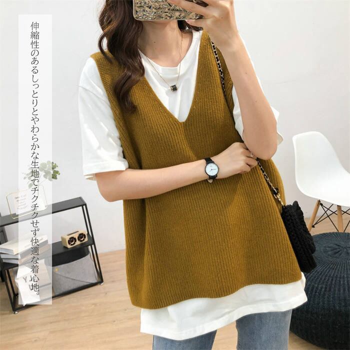 レディース ニットベスト ジレ レイヤード セーター チュニック Vネック